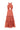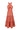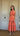 Orange midi dress with a small blue polka dot print. Crossed neckline at the front and back, and a long skirt made up of three pieces finished with contrasting blue trim.