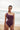 Maillot de bain en lycra de haute qualité couleur aubergine (poids de 190 m2). Avec une coupe asymétrique et fini avec un passepoil mauve contrasté. Doublure intérieure.